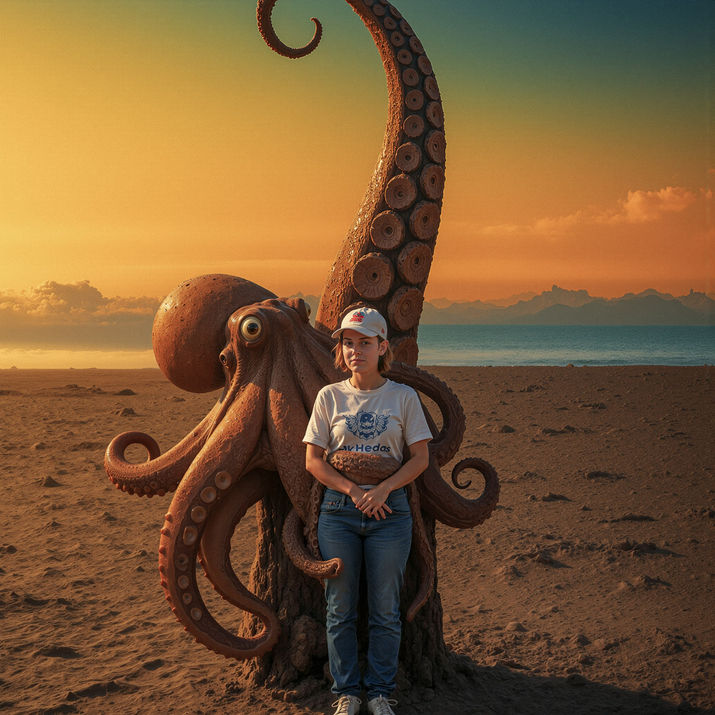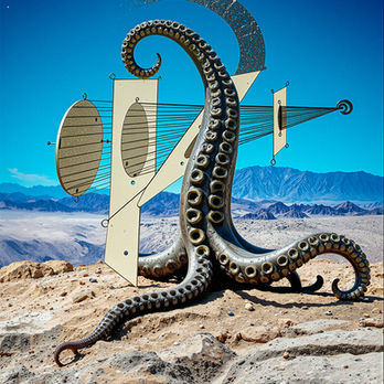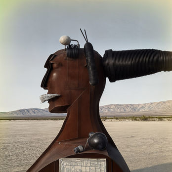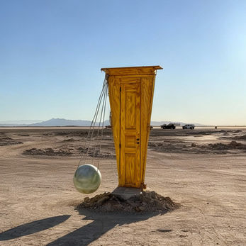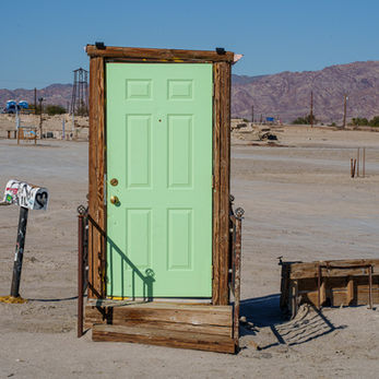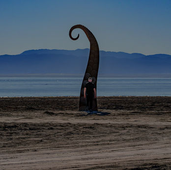 The series of images below represents a reimagined evolution of the images above, where documentary photography meets generative transformation. Using AI image prompting, multiple real moments from our trips with Russell Brown were blended, recontextualized, and re-lit to create surreal composites that extend the story beyond what the camera captured. Sculptural elements, tentacles, musical instruments, and symbolic doors emerge from the desert floor, fusing human presence with mythic forms. These AI interpretations preserve the mood and spatial memory of the Salton Sea while introducing a dreamlike logic, turning the landscapes, light-painting experiments, and spontaneous scenes into cinematic visions of imagination unbound.